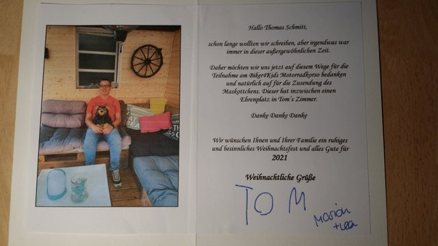 Nach der Tour habe ich mit dem Veranstalter Kontakt aufgenommen und dann den Bären meinem Team Leader Tom zugeschickt. Ein paar Wochen später kam dann ein Brief, der mich sehr berührt und auch etwas stolz gemacht hat. Es war die richtige und gute Entscheidung da mitzumachen.
