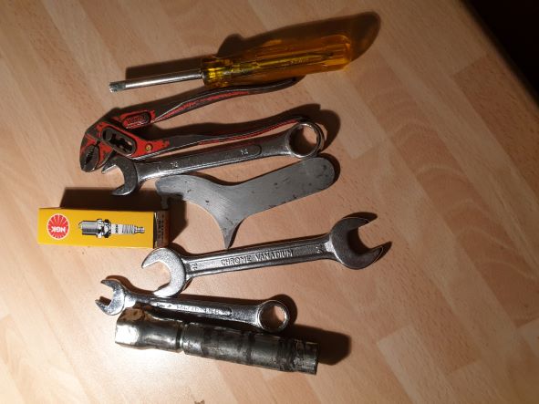 Meine Auswahl umfasst bisher den geretteten Versteller für die Federbeine und die Kerzennuss. Aus meinem großen Werkzeug Arsenal habe ich noch einige gängige Gabelschlüssel, kleine Zange und Wechselschraubendreher beigefügt.  Ebenso habe ich an eine Ersatzzündkerze gedacht.  Es fehlen noch ein paar Sicherungen, Kabelbinder, Isolier,- oder Klebeband und Ersatzbirnchen für das Hauptlicht.