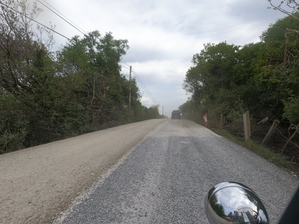 An das Gewackel habe ich mich inzwischen gewöhnt. Prinzipiell freue ich mich ja auch über Baustellen, denn das heißt sie machen die Straße besser. Zwischendurch besteht die dafür aber dann auch mal nur aus Kies und sieht so aus: