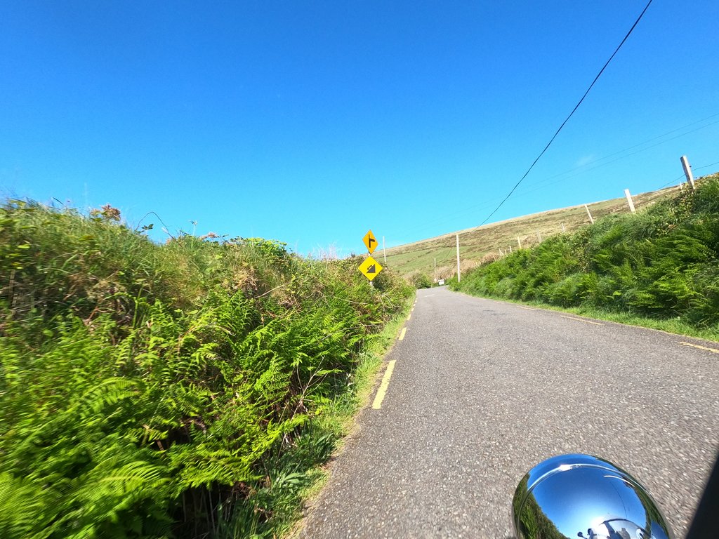 Zurück an Land hole ich meine Nixe wieder aus ihrem Mittagsschlaf. Es geht ein Stück die Küste zurück – ich will mir die Kerry Cliffs noch von oben anschauen! Man beachte die irische Schilderversion von "es geht steil bergauf"!