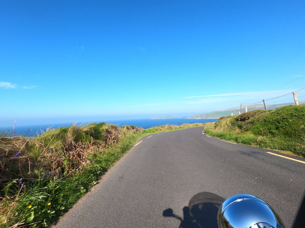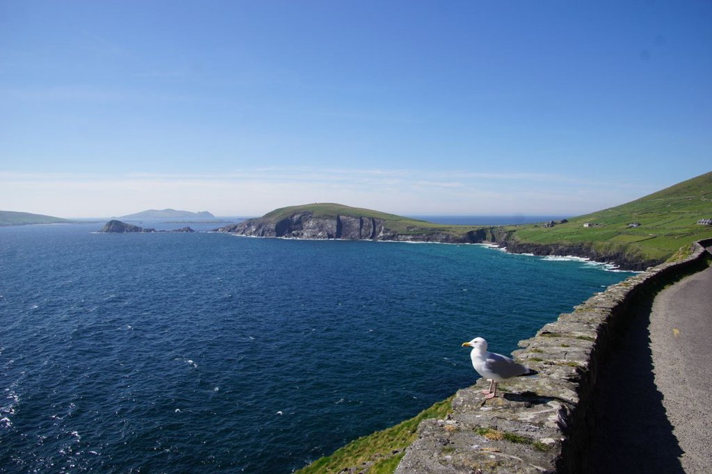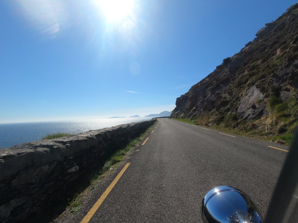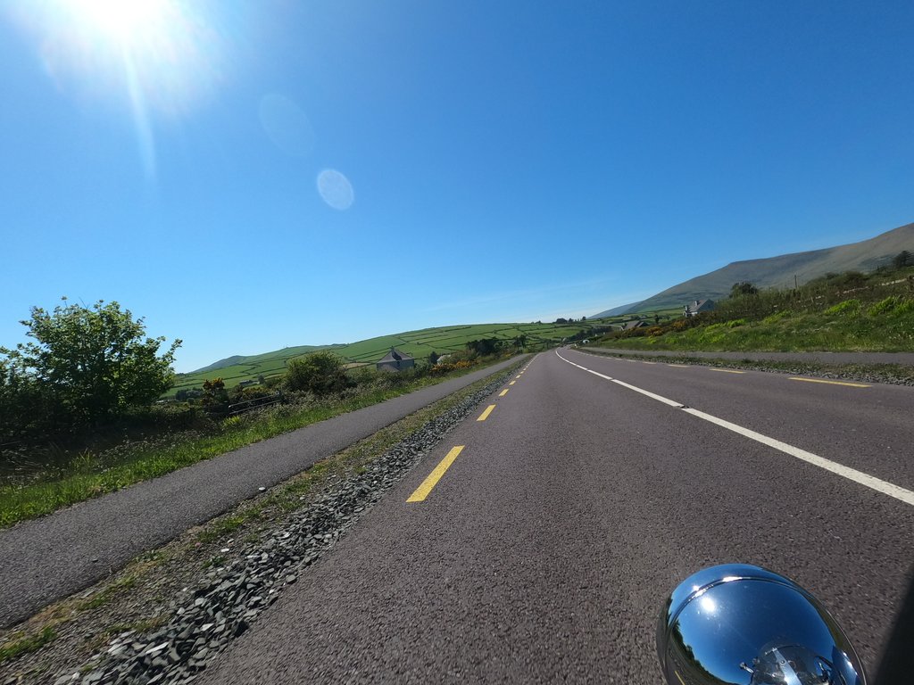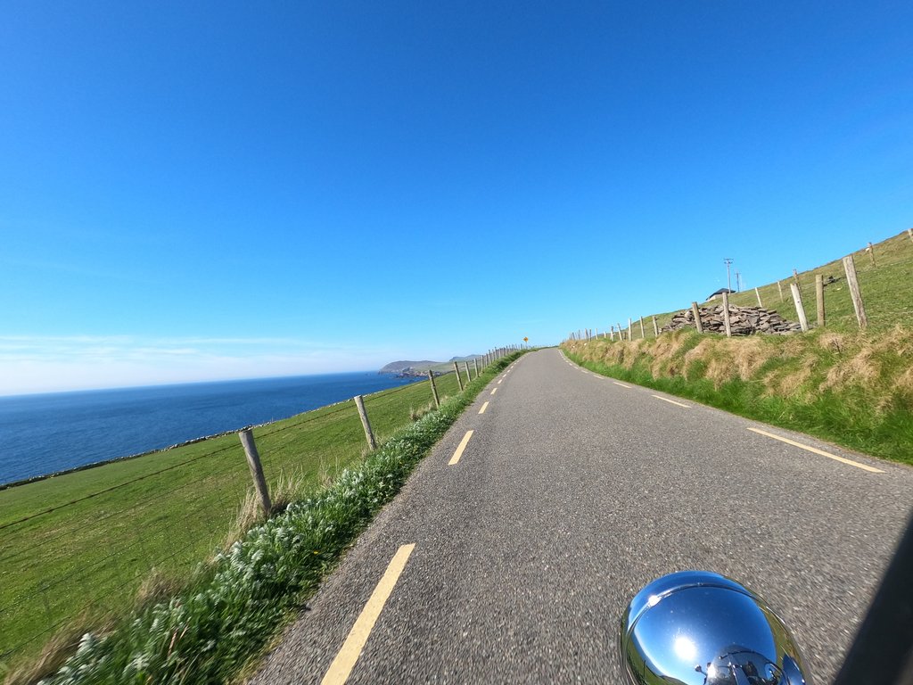 Auf der Weiterfahr lernen wir dann, dass Irland nicht nur schöne Küstenstraßen hat. Die Fahrt von Portmagee bis Dingle zieht sich unheimlich und die Straßen auf der Dingle Halbinsel gehen fast ausschließlich schnurgeradeaus. Aussicht gibt es auch nicht viel und wenn dann wird sie von den seitlichen Steinwällen versperrt. Etwas ermüdend das Ganze...