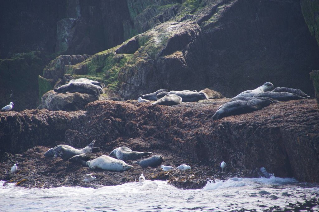 Obwohl das Meer vom Strand aus sehr ruhig aussah, ist es alles andere als das. Unser Boot schaukelt schöner als es jede Achterbahn mit 3D-Bewegung könnte. Man braucht schon einen starken Magen für diesen Trip heute. Ich lenke mich mit Vogelbeobachtung ab. Auch ein paar Puffins lassen sich sehen, sind aber zu schnell für meinen Autofokus. Wer diese wunderschönen Vögel nicht kennt, einfach mal googeln! Ich freue mich jedenfalls riesig welche gesehen zu haben, auch wenns kein Foto von ihnen gibt.