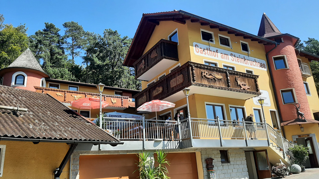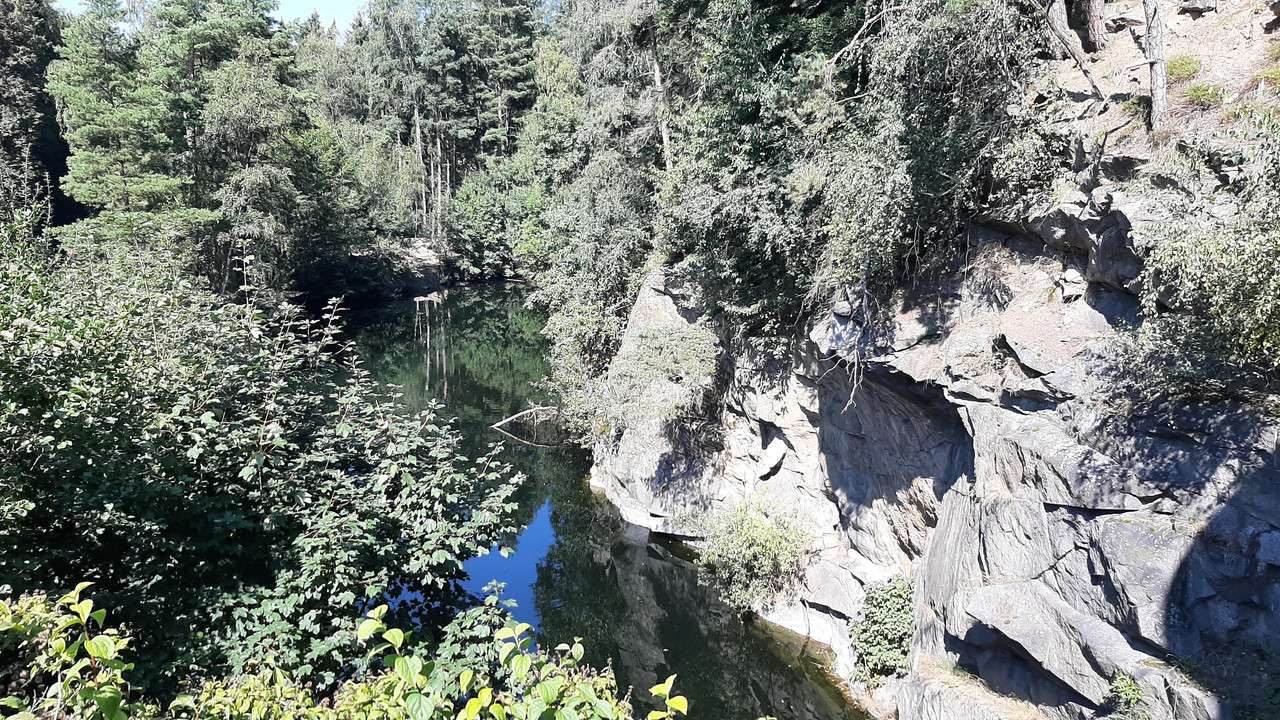 also Kehrtwendung und wieder zurück. Dann ging es wieder den richtigen Weg. Über Waldmünchen und Furth i. W. ging es Richtung Rimbach. Hier stand aufeinmal eine große Holztafel am Straßenrand und da es eh Mittagszeit war und der Magen knurrte, fuhren wir einfach mal dort hin. Es war ein sehr schönes "Gasthaus am Steinbruchsee" mit Wildgehege, Waldmuseum und eben ein kleiner See. Es gab einen deftigen Schweinsbraten mit Knödel. War lecker.