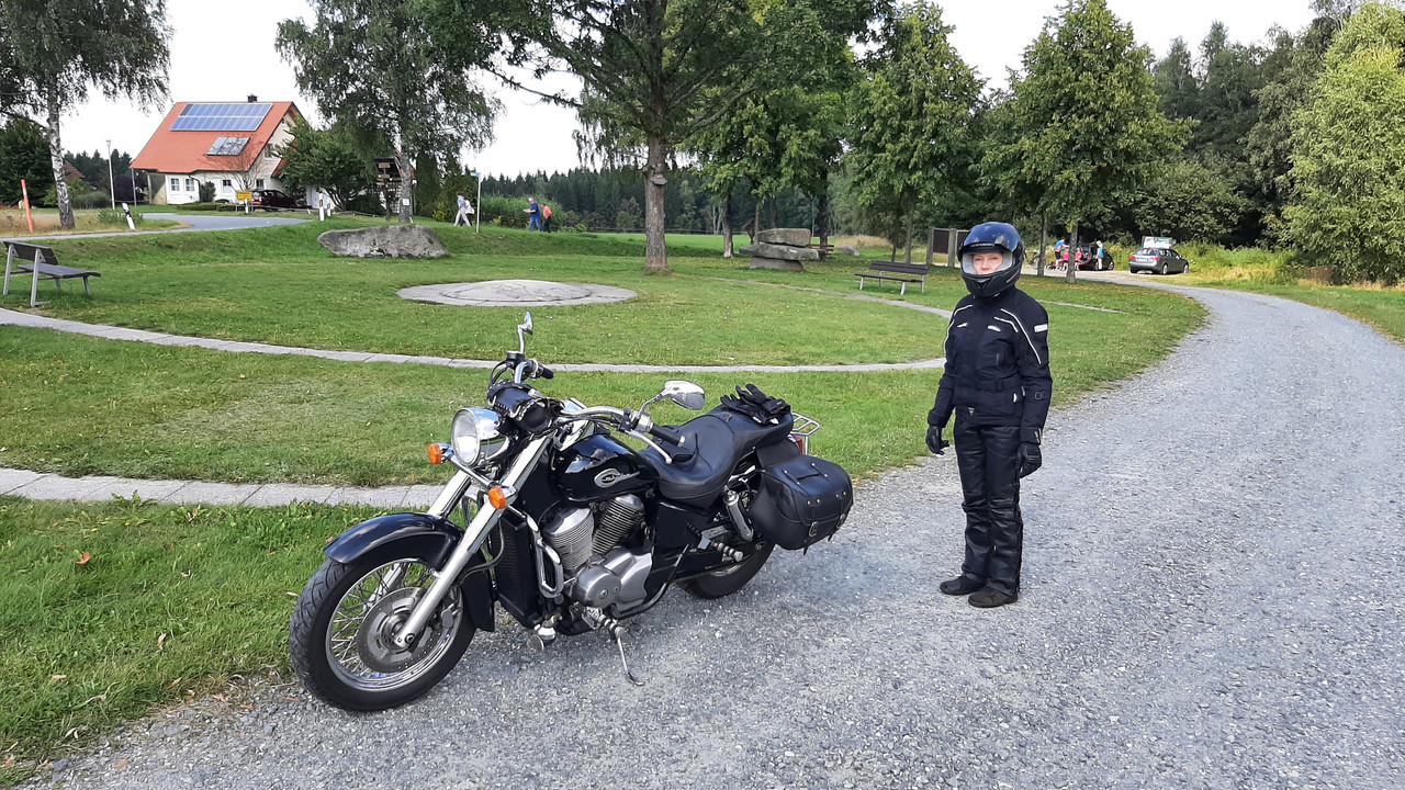 Manuela und ich haben heute eine sehr schöne Tour durch die nordöstliche Oberpfalz unternommen. Geplant hatte ich nichts, darum sind wir aufs grade Wohl losgefahren. Es waren bestimmt 90 % der Tour, wo ich noch nicht gefahren bin, aber so schöne Strecken, bedingt auch durch 2 Umleitungen. Unterwegs musste ich dann erst mal anhalten, zum Glück kam ein Parkplatz. Denn auf meinem Tacho erschien folgendes: