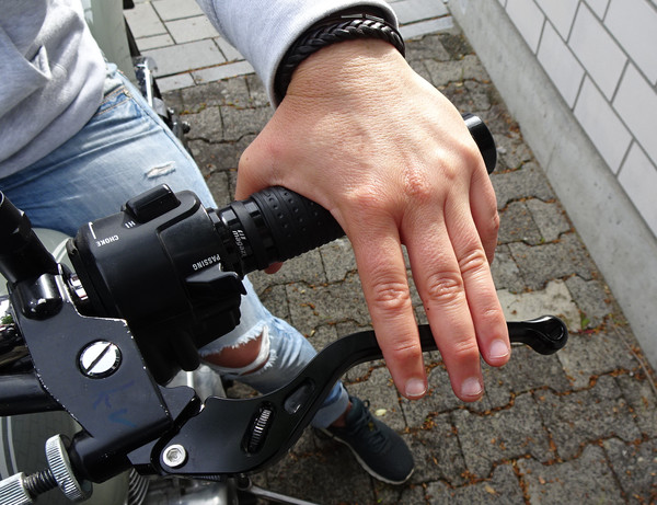 Vorher kam sie geradeso mit den Fingerspitzen an die Hebel. Wenn sie mit eingeschlagenem Lenker losfahren wollte, hatte sie immer arge Schwierigkeiten. Da wird sie jetzt wohl besser zurecht kommen.