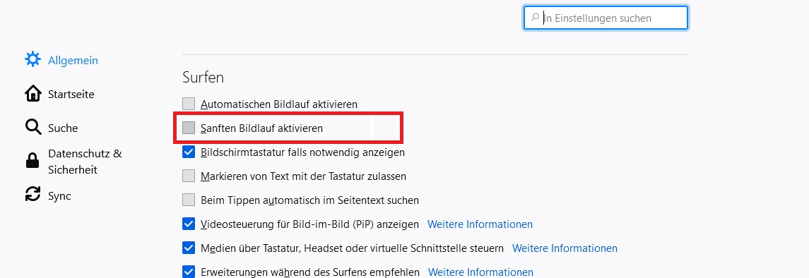 - Sanften Bildlauf aktivieren (bitten Haken raus)