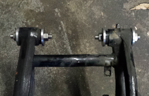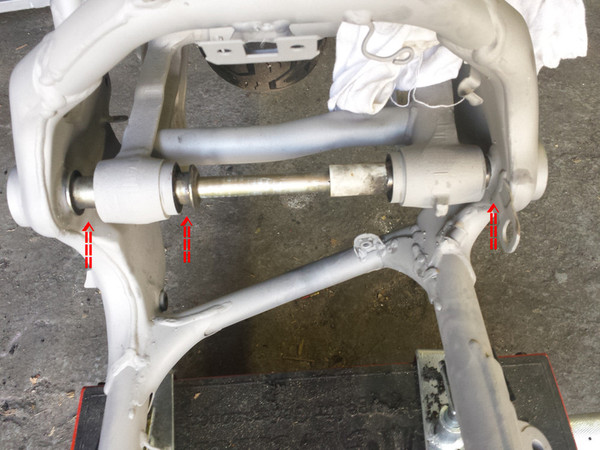 Ich hab jetzt mal provisorisch Schwinge und Gabel eingesetzt um die Tieferlegung zu kontrollieren und um zu probieren wie Grit mit der Dragbar zurecht kommen würde. Dabei sind mir die Abstände hier aufgefallen. In der Mitte sitzt ja der Motor, aber der Platz bei den Buchsen ?