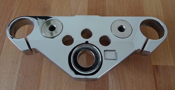 Die Gabelbrücke habe ich jetzt nochmal zart übergefräst um die Macken rauszubekommen. Anschließend Glasperlengestrahlt und jetzt kann sie zum verchromen.
