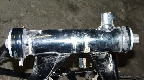 Heute habe ich Rahmen, Hilfsrahmen und Schwinge zum Sandstrahlen gebracht. Um mir das Ausbauen der Lager in der Schwinge zu ersparen, bin ich nach dem gleichen Prinzip vorgegangen wie beim Steuerkopf.Ein Bolzen Durchmesser 15mm und einer 22mm