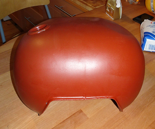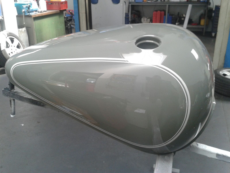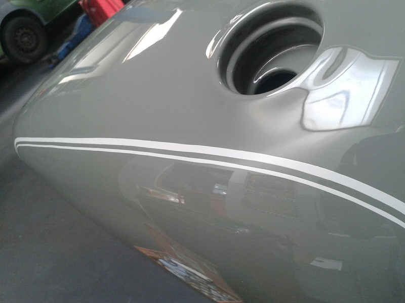Der Tank hielt keine Überraschungen unter der dicken Lackschicht bereit. Keine Dellen und nix gespachtelt. Sieht tadellos aus.