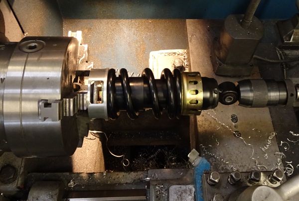 Dann habe ich das Federbein in die Drehbank eingespannt um zu sehen wie das funktioniert um die Aufnahme von der Kolbenstange zu schrauben. Dazu hatte ich mir eine Hülse gedreht und Fenster reingefräst, damit ich natürlich auch was sehe.