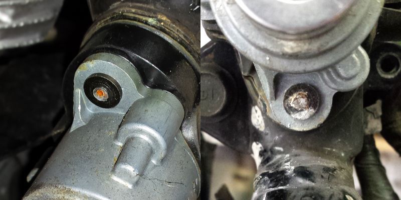 Ich hatte mich gewundert, daß ich das Zündschloß nicht ab bekomme......bis ich der Sache etwas näher auf den Grund gegangen bin. Nach eingehender Inspektion der Sachlage bin ich zu dem Schluß gekommen, daß hier ein "Experte" beide Schraubenköpfe abgedreht haben muß.![]()